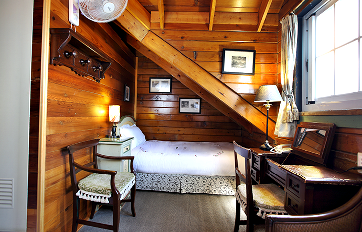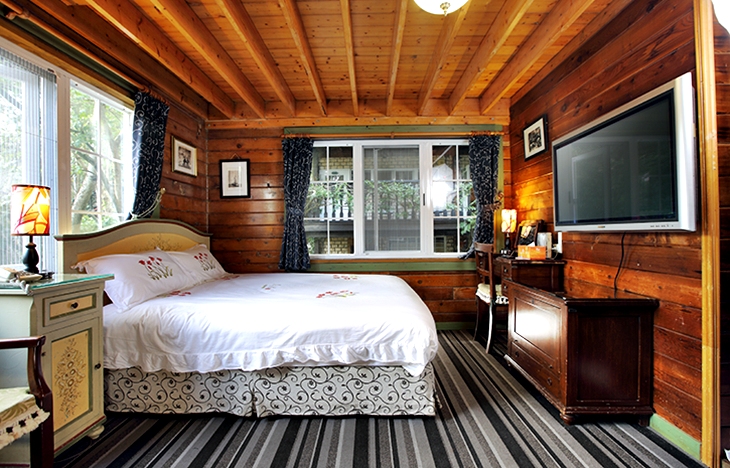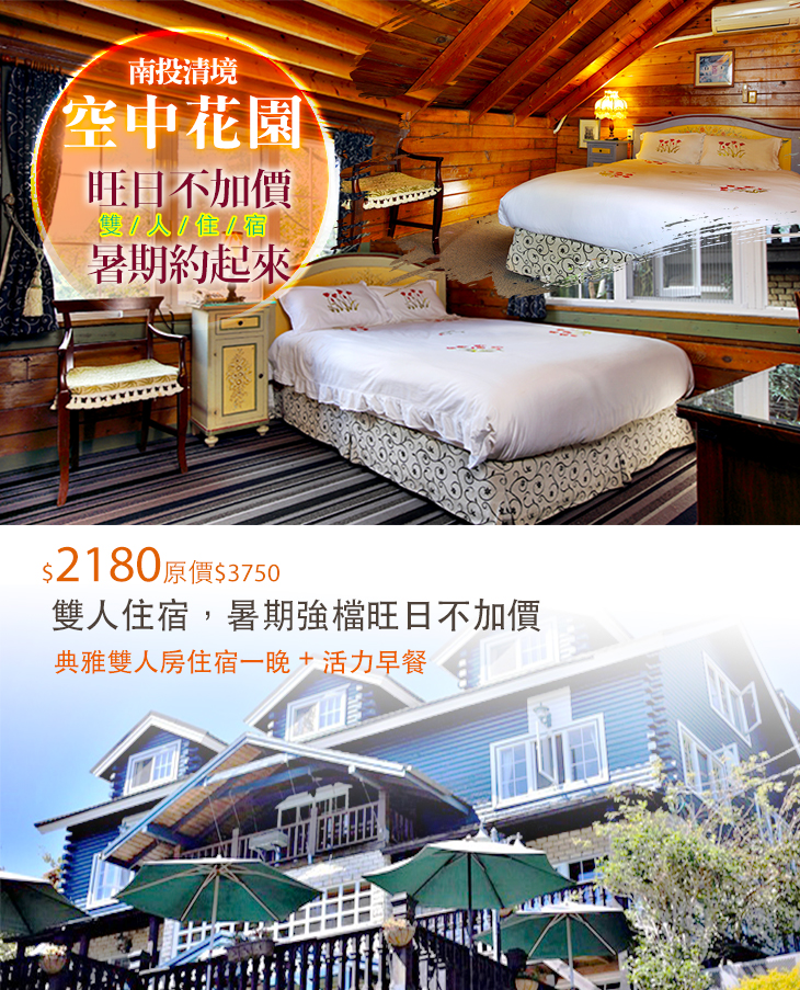 空中花園,說不上大飯店的氣派,卻流露著一股溫馨的氣息,而內部的裝潢也多用書香及花卉,小至窗簾布、掛滿窗的乾燥麥桿菊、星辰花,大至整個原木的結構,處處散發著迷人的歐式陳設風格。