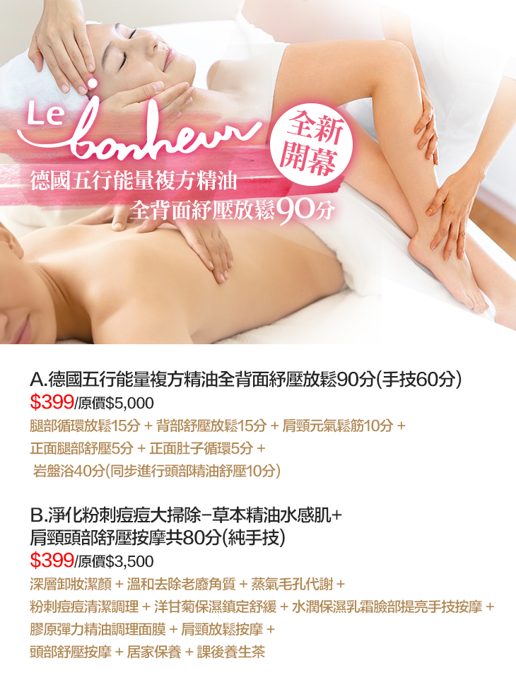A.德國五行能量複方精油全背面紓壓放鬆90分(手技60分) / B.淨化粉刺痘痘大掃除-草本精油水感肌+肩頸頭部舒壓按摩共80分(純手技)