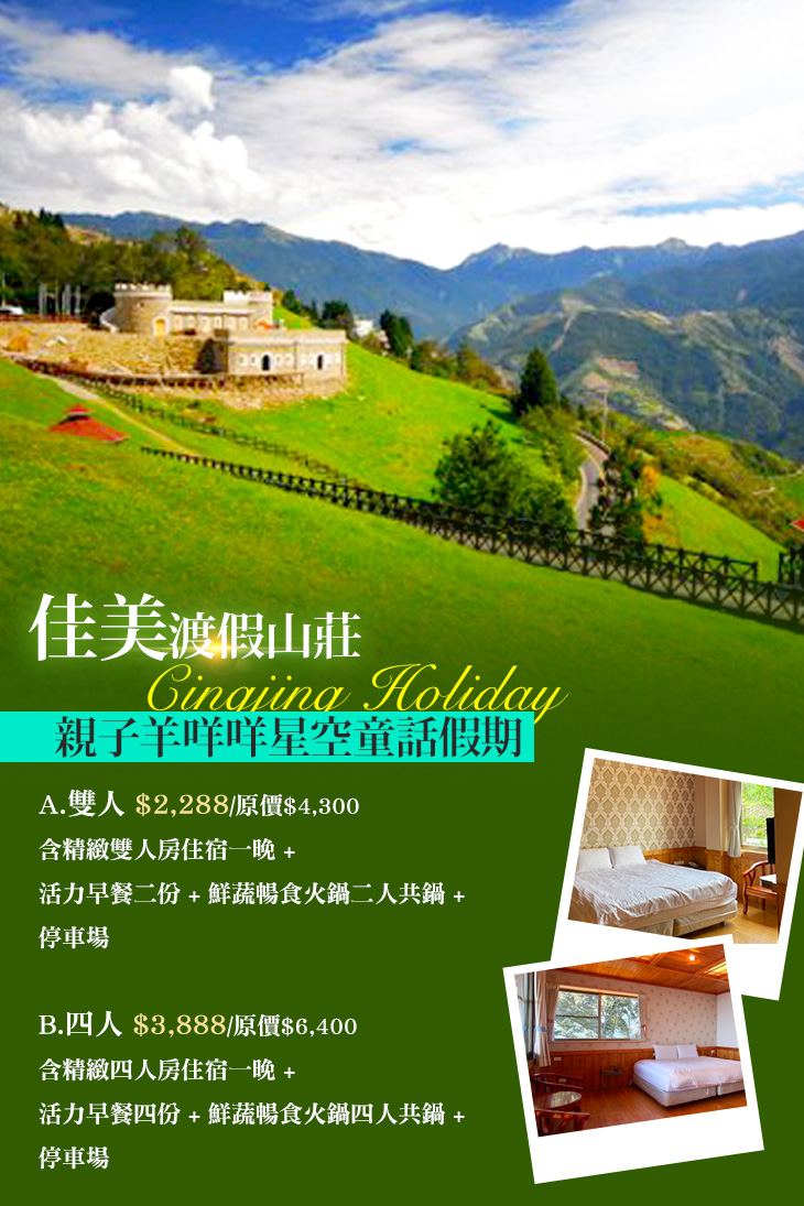 佳美休閒山莊四周群山環抱,陽光照耀時大自然美景映入眼簾,白雲霧氣圍繞時,更是有朦朧美,想在傍晚來杯咖啡享受涼風吹拂嗎?想在夜晚與美麗夜景共渡良宵嗎?想在早晨有可愛的鳥叫聲伴隨著你這美妙的一天嗎?遠離那市區的塵囂來清境佳美吧!.jpg)