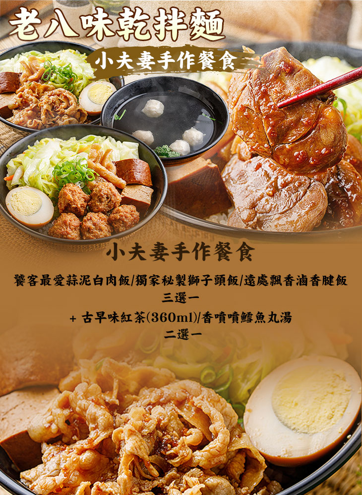 【老八味乾拌麵】專賣美味的中式料理,堅持嚴選新鮮食材,並運用多年廚藝經驗,將食材調味出最完美的口感,肉類甘甜不油膩、配菜清淡不搶味,100分的美味,使用餐儼然變成了一種享受。簡約乾淨的空間,在傳統與現代間,找到更貼近人心的連接,希望讓每位客人在生活忙碌之餘,也能好好吃飯,享受「吃」所帶來的美好感受!