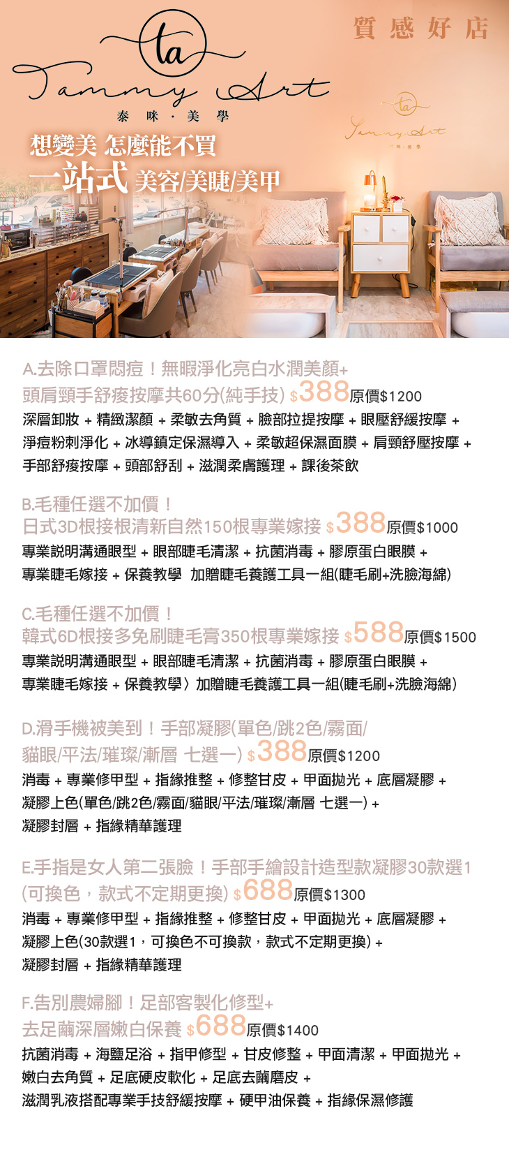 A.去除口罩悶痘!無暇淨化亮白水潤美顏+頭肩頸手舒痠按摩共60分(純手技) / B.毛種任選不加價!日式3D根接根清新自然150根專業嫁接 / C.毛種任選不加價!韓式6D根接多免刷睫毛膏350根專業嫁接 / D.滑手機被美到!手部凝膠(單色/跳2色/霧面/貓眼/平法/璀璨/漸層 七選一) / E.手指是女人第二張臉!手部手繪設計造型款凝膠30款選1(可換色,款式不定期更換) / F.告別農婦腳!足部客製化修型+去足繭深層嫩白保養