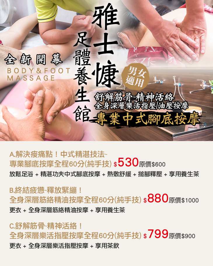 A.解決痠痛點!中式精湛技法~專業腳底按摩全程60分(純手技) / B.終結疲憊~釋放緊繃!全身深層筋絡精油按摩全程60分(純手技) / C.舒解筋骨~精神活絡!全身深層樂活指壓按摩全程60分(純手技)
