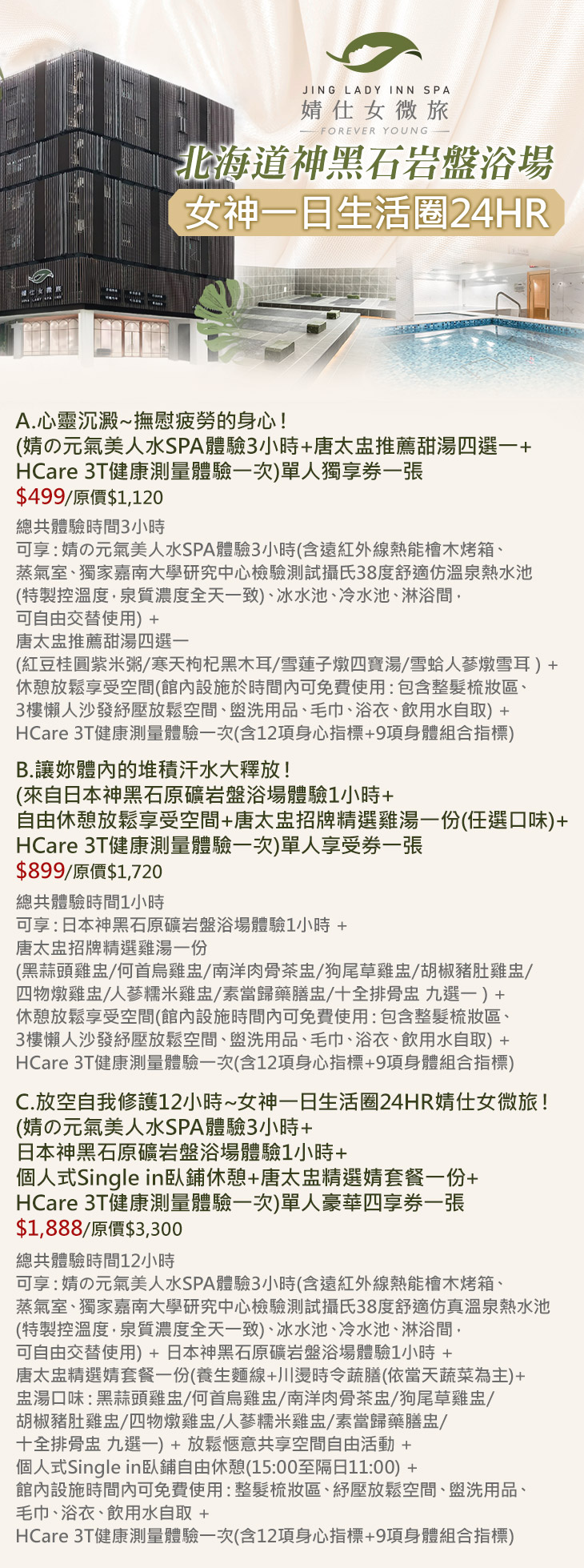 A.(婧の元氣美人水SPA體驗3小時+唐太盅推薦甜湯四選一+HCare 3T健康測量體驗一次)單人獨享券一張 / B.(來自日本神黑石原礦岩盤浴場體驗1小時+自由休憩放鬆享受空間+唐太盅招牌精選雞湯一份(任選口味)+HCare 3T健康測量體驗一次)單人享受券一張 / C.(婧の元氣美人水SPA體驗3小時+日本神黑石原礦岩盤浴場體驗1小時+個人式臥鋪休憩+唐太盅精選婧套餐一份+HCare 3T健康測量體驗一次)單人豪華四享券一張
