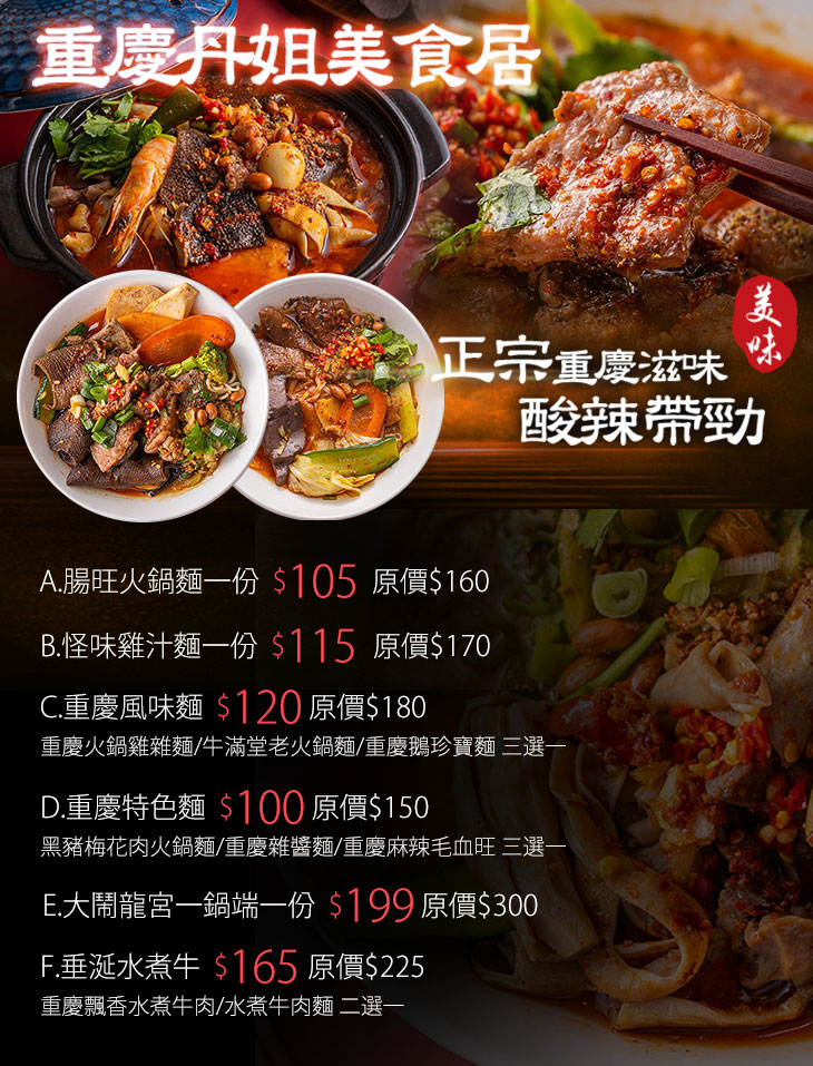 正宗重慶美味,給您酸辣酥麻、大呼過癮的味覺饗宴!──【重慶丹姐美食居】主打道地的重慶料理,除了香辣入味的重慶麻辣小麵、老火鍋麻辣燙,還有料多豐盛、口感彈嫩的手工酸辣粉…等,選擇豐富的經典美味,讓您一嚐重慶來的好滋味~
