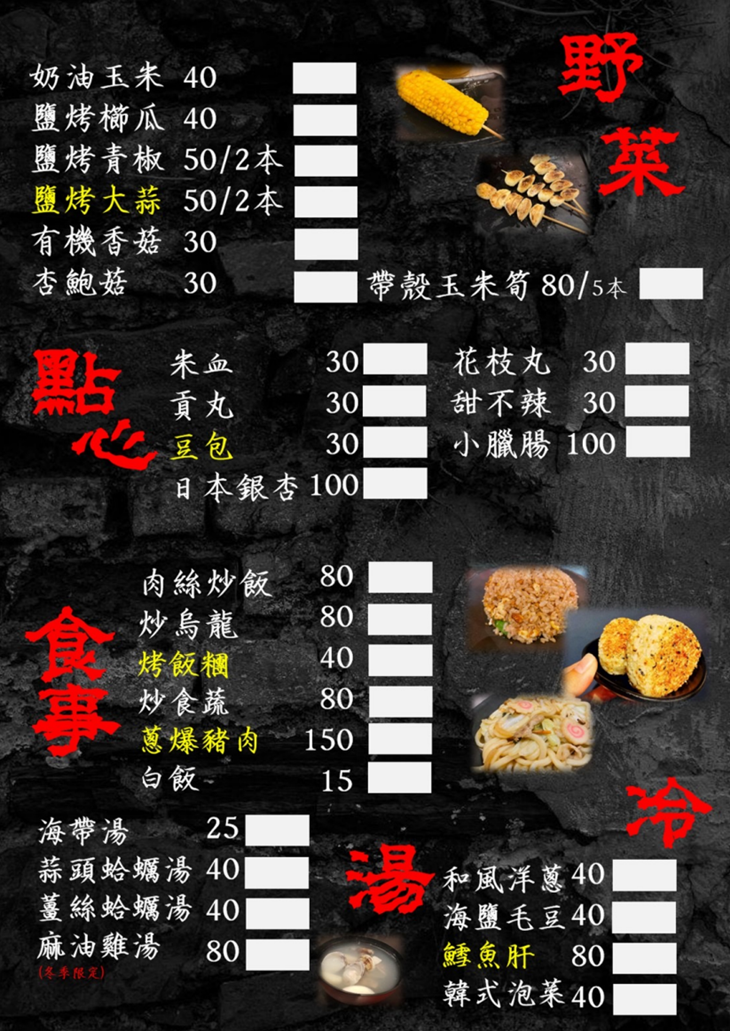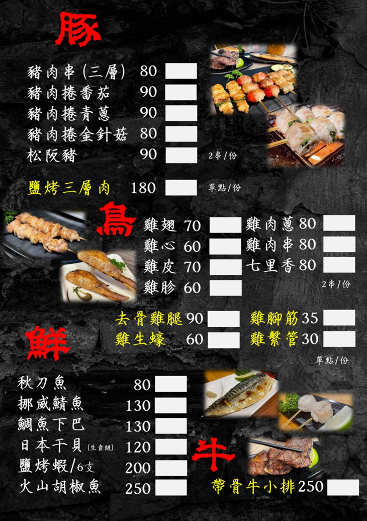 堅持品質,堅持食材的原味!店內遵循食材全程使用炭火燒烤,絕不經油炸等預熱處理,就是要讓客人吃到最鮮美的食材,給您最當初的美味感動,與三五好友在此處細品餐點、感受美好的夜晚,就是生活中最幸福的事了 ~ 誠摯邀請您來品嚐!
