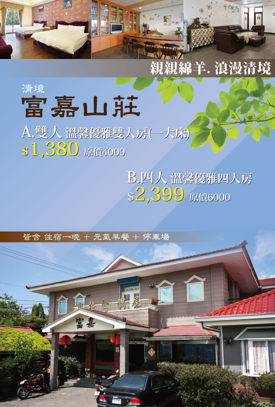 【富嘉山莊】位於南投仁愛鄉海拔高達2000公尺的山野之中,青草悠悠的清境農場、楓葉翩翩的奧萬大、繽紛的小瑞士花園和冬季白雪崖崖的合歡山等熱門景點皆座落於此;酸辣辛香的雲南擺夷風味料理更是這裡的一大特色。喜歡縱情山野、漫步自然的您,可隨興踏遊於此,感受山野的寧靜柔美、飄逸淡泊。
