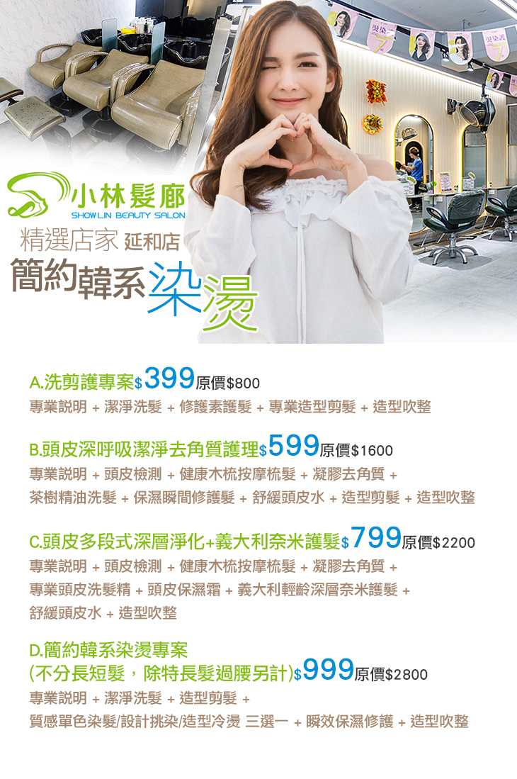 A.洗剪護專案 / B.頭皮深呼吸潔淨去角質護理 / C.頭皮多段式深層淨化+義大利奈米護髮 / D.簡約韓系染燙專案(不分長短髮,除特長髮過腰另計)