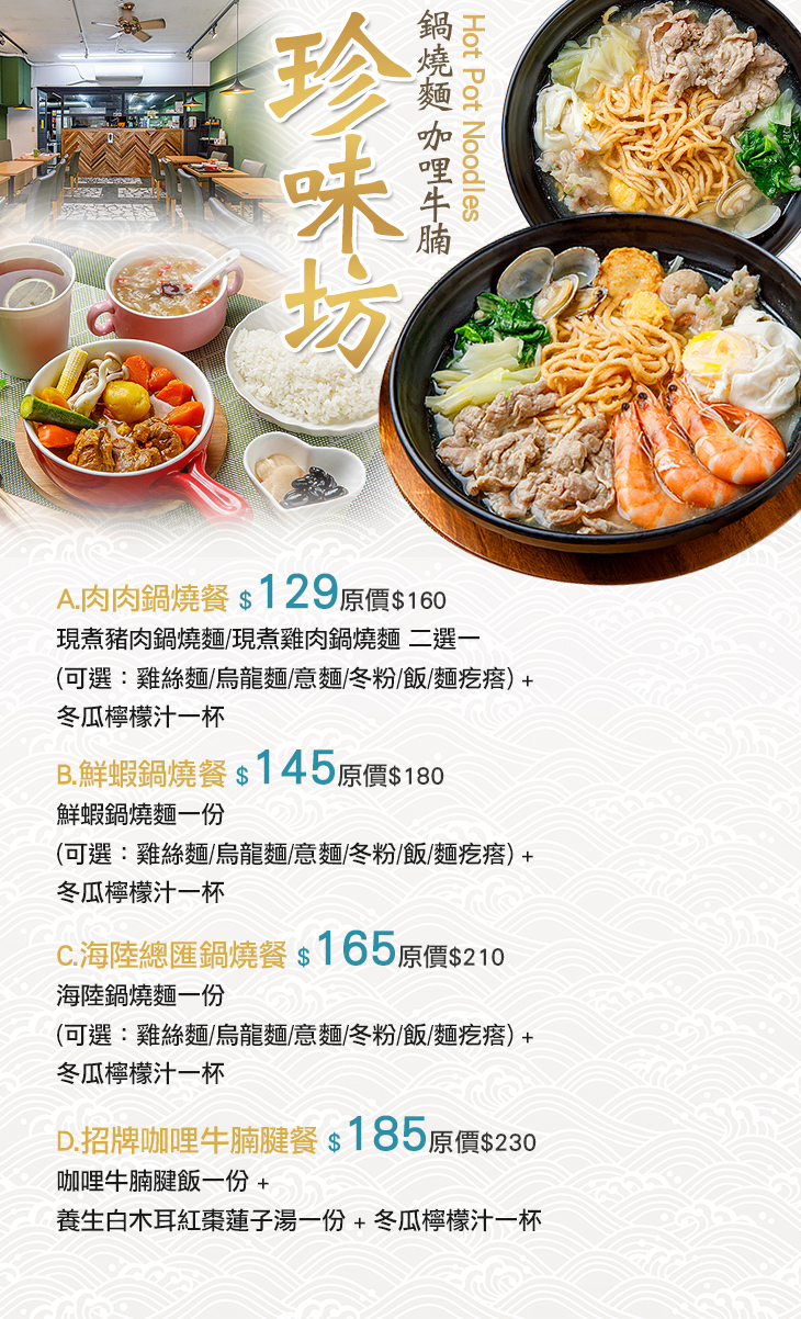 【珍味坊】專賣熱呼呼的鍋燒麵,可搭配豬肉、雞肉與海鮮,就連麵條也可依個人喜好選擇 ~ 店家堅持用心挑選好食材,湯鮮、肉甜、味美,每道程序都相當謹慎,完美展現最經典的鍋燒美味!除了招牌麵食之外,也有料多實在的飯食可選擇,平價飄香的銷魂魅力,絕對值得您細細品嚐唷!