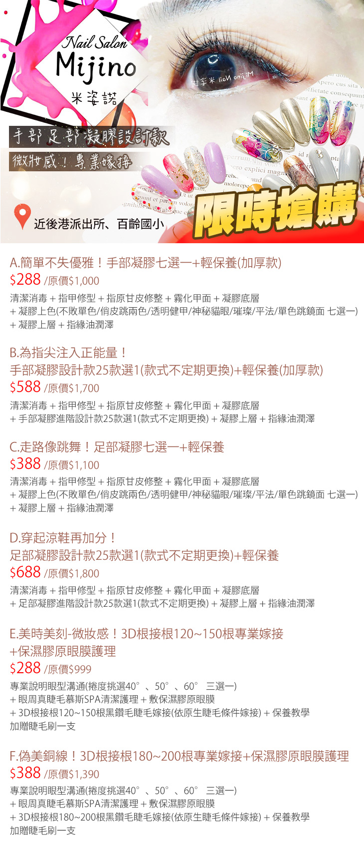 A.簡單不失優雅!手部凝膠七選一+輕保養(加厚款) / B.為指尖注入正能量!手部凝膠設計款25款選1(款式不定期更換)+輕保養(加厚款) / C.走路像跳舞!足部凝膠七選一+輕保養 / D.穿起涼鞋再加分!足部凝膠設計款25款選1(款式不定期更換)+輕保養 / E.美時美刻-微妝感!3D根接根120~150根專業嫁接+保濕膠原眼膜護理 / F.偽美銅線!3D根接根180~200根專業嫁接+保濕膠原眼膜護理