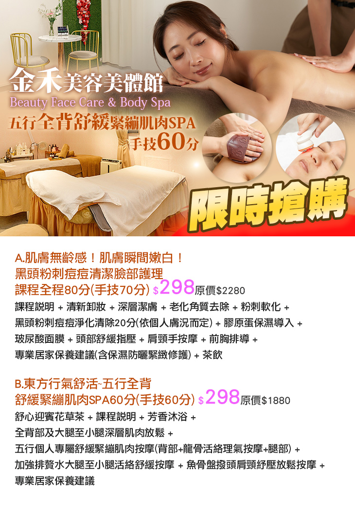 A.肌膚無齡感!肌膚瞬間嫩白!黑頭粉刺痘痘清潔臉部護理課程全程80分(手技70分) / B.東方行氣舒活~五行全背舒緩緊繃肌肉SPA60分(手技60分)