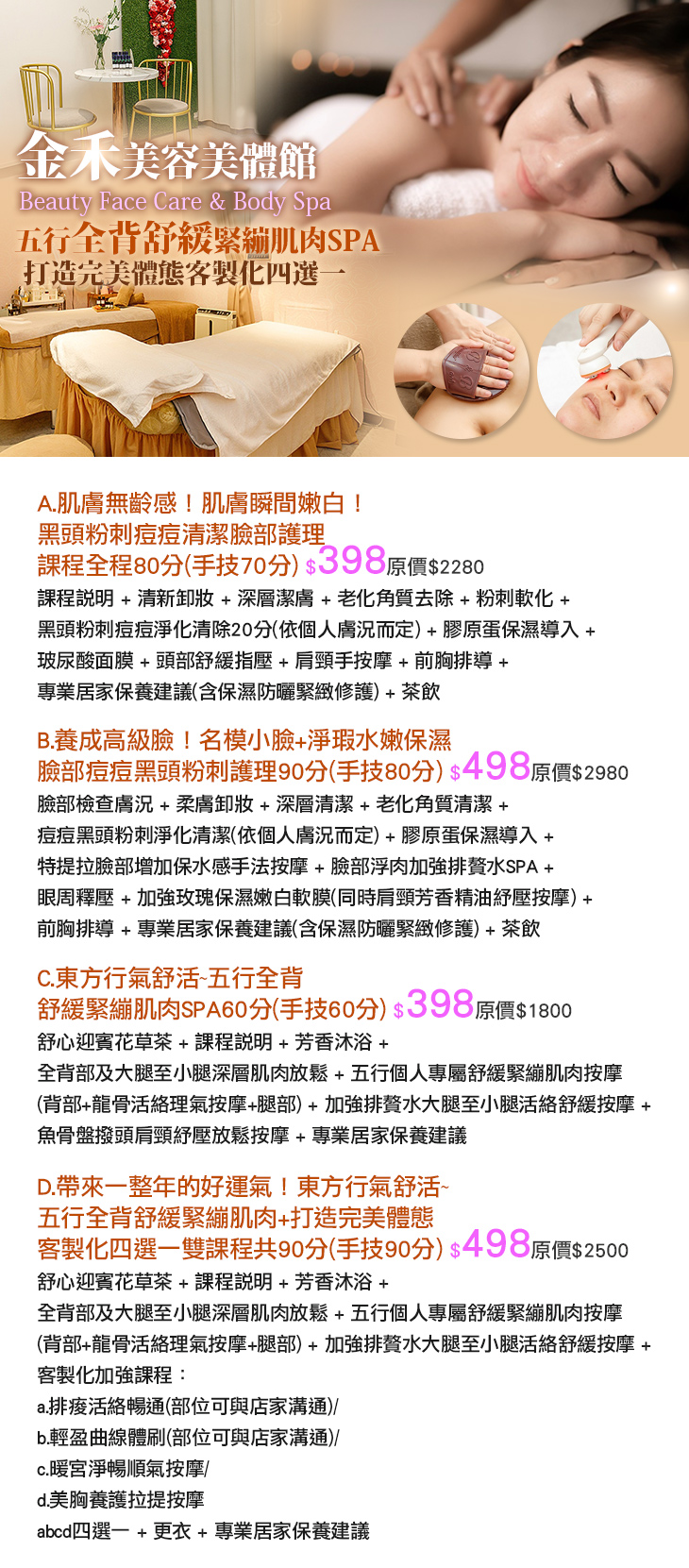 A.肌膚無齡感!肌膚瞬間嫩白!黑頭粉刺痘痘清潔臉部護理課程全程80分(手技70分) / B.養成高級臉!名模小臉+淨瑕水嫩保濕臉部痘痘黑頭粉刺護理90分(手技80分) / C.東方行氣舒活~五行全背舒緩緊繃肌肉SPA60分(手技60分) / D.帶來一整年的好運氣!東方行氣舒活~五行全背舒緩緊繃肌肉+打造完美體態客製化四選一雙課程共90分(手技90分)