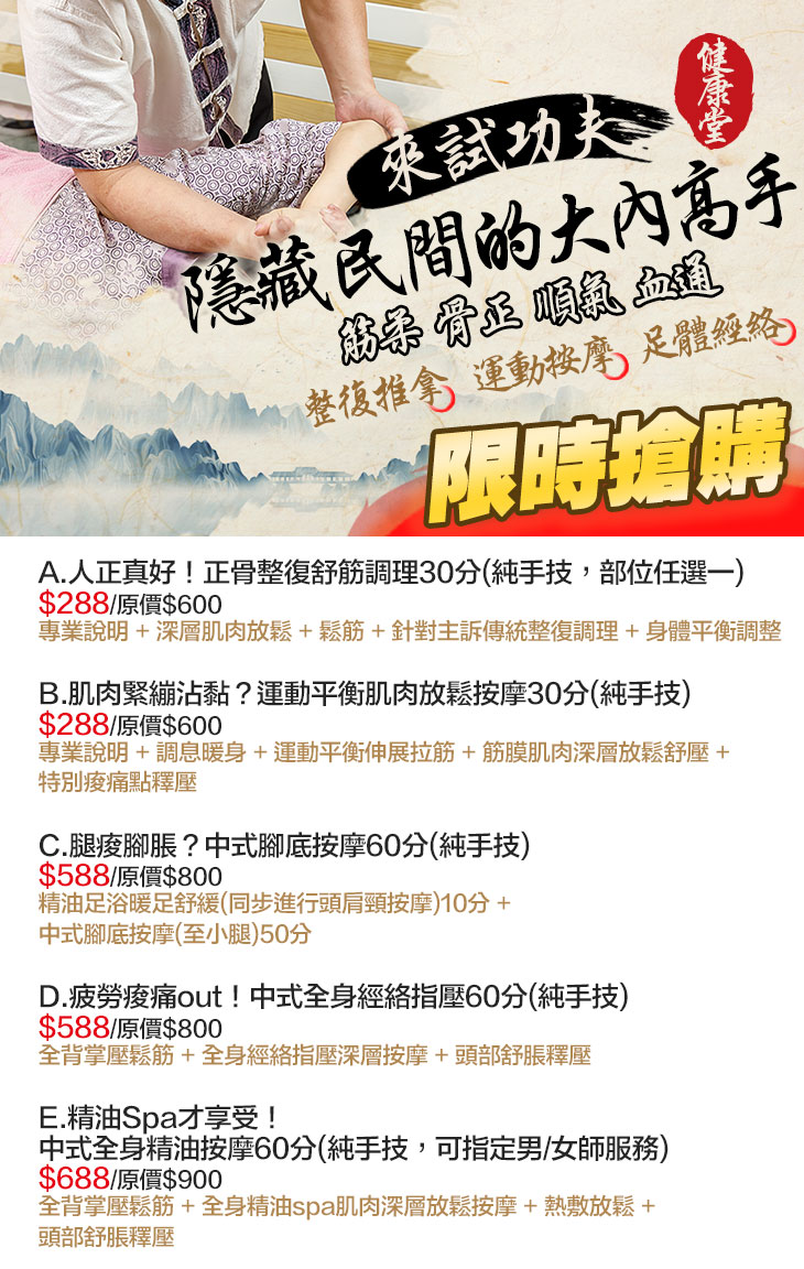 A.人正真好!正骨整復舒筋調理30分(純手技,部位任選一) / B.肌肉緊繃沾黏?運動平衡肌肉放鬆按摩30分(純手技) / C.腿痠腳脹?中式腳底按摩60分(純手技) / D.疲勞痠痛out!中式全身經絡指壓60分(純手技) / E.精油Spa才享受!中式全身精油按摩60分(純手技,可指定男/女師服務)