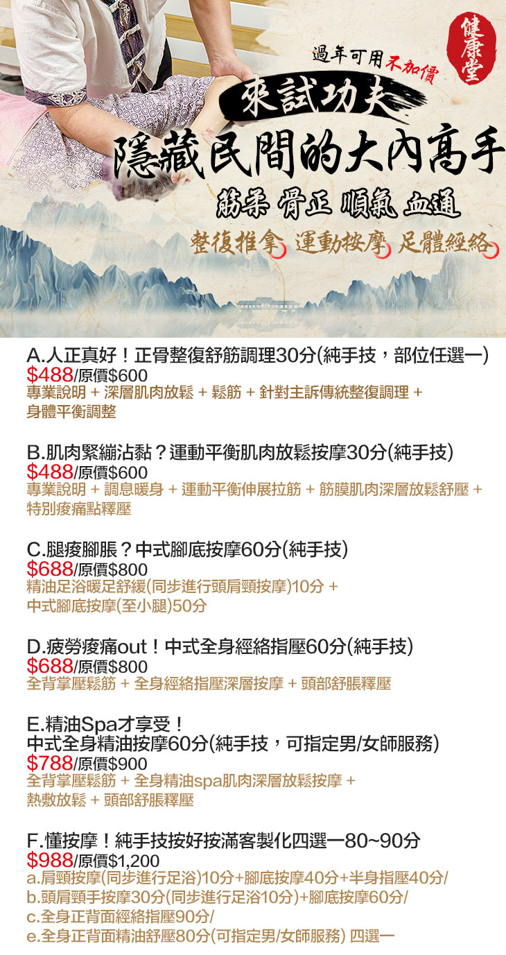 A.人正真好!正骨整復舒筋調理30分(純手技,部位任選一) / B.肌肉緊繃沾黏?運動平衡肌肉放鬆按摩30分(純手技) / C.腿痠腳脹?中式腳底按摩60分(純手技) / D.疲勞痠痛out!中式全身經絡指壓60分(純手技) / E.精油Spa才享受!中式全身精油按摩60分(純手技,可指定男/女師服務) / F.懂按摩!純手技按好按滿客製化四選一80~90分
