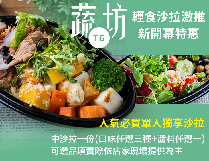 歡慶新據點開幕!一句話:『新鮮、健康、快速!』——【TG 蔬坊 The Greenery】從南港發跡,主打新鮮快速、健康可口的生菜沙拉,並透過外帶方式,致力為忙碌的現代人提供全新的飲食型態,讓您我可以把健康、美味帶著走,隨時隨地享用!