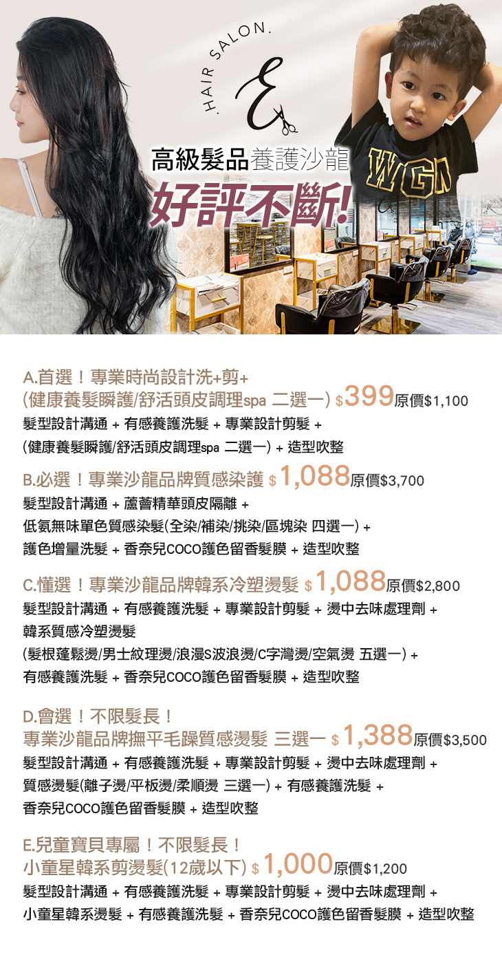 A.首選!專業時尚設計洗+剪+(健康養髮瞬護/舒活頭皮調理spa 二選一) / B.必選!專業沙龍品牌質感染護 / C.懂選!專業沙龍品牌韓系冷塑燙髮 / D.會選!不限髮長!專業沙龍品牌撫平毛躁質感燙髮 三選一 / E.兒童寶貝專屬!不限髮長!小童星韓系剪燙髮(12歲以下)