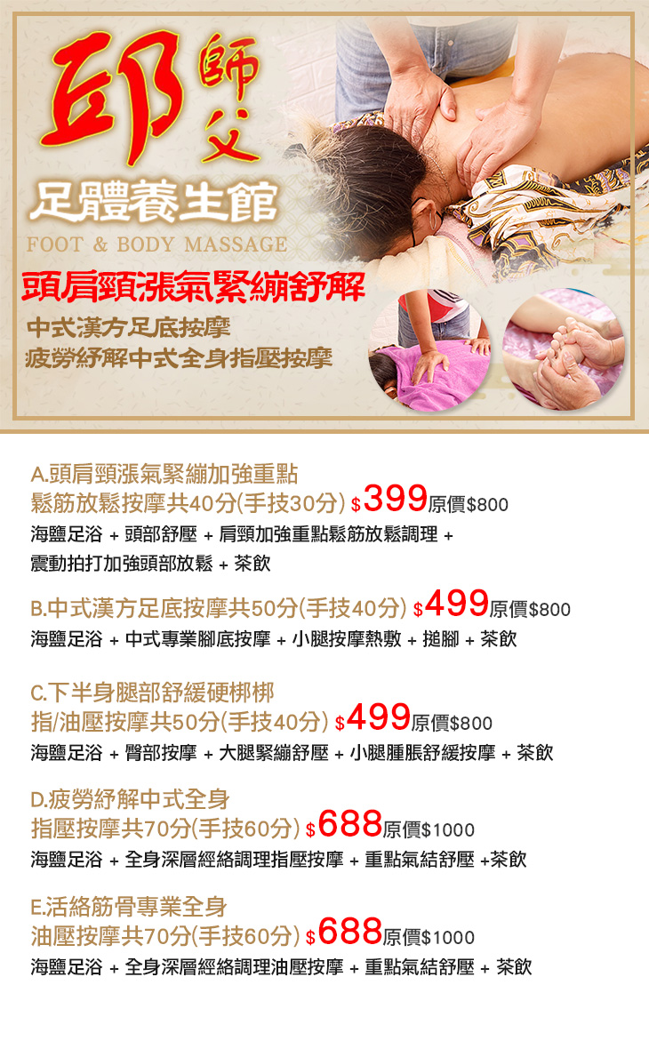 A.頭肩頸漲氣緊繃加強重點鬆筋放鬆按摩共40分(手技30分) / B.中式漢方足底按摩共50分(手技40分) / C.下半身腿部舒緩硬梆梆指/油壓按摩共50分(手技40分) / D.疲勞紓解中式全身指壓按摩共70分(手技60分) / E.活絡筋骨專業全身油壓按摩共70分(手技60分)