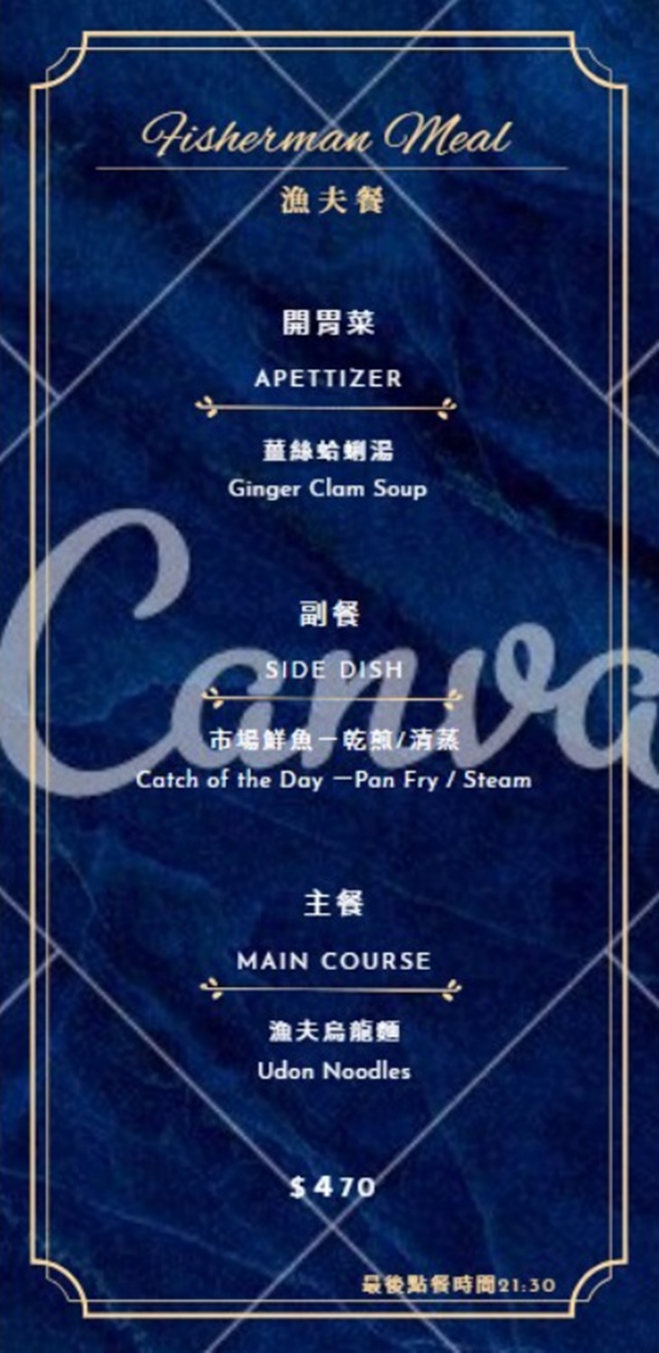 店家基於對漁夫的一份珍愛與尊敬,特別推出超厲害的漁夫餐,想將用生命從大海換來的美味鮮品,奉獻給所有親愛的朋友!堅持現點現做,以嚴選海洋野生魚作為主角,透過乾煎的方式料理,外衣焦脆、肉質細緻,搭配烏龍麵及暖心湯品,帶給您充滿驚喜的美食饗宴!
