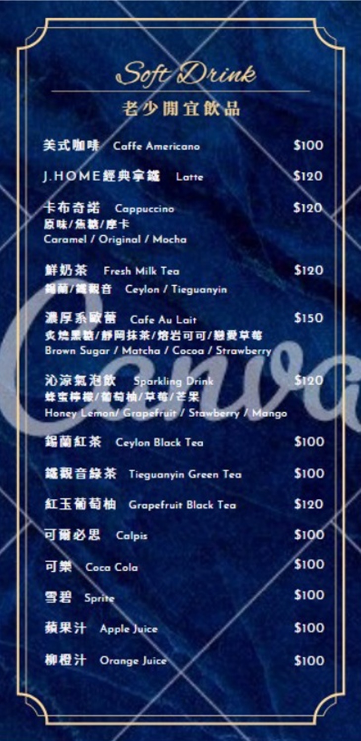還在尋找兼具美食及舒適空間的地方嗎?【J Home】會是您最好的選擇唷!店內擁有寬敞明亮的環境,在柔和燈光的照映下,顯得溫馨而寧靜,適合小型聚會、茶會等會議使用。【J Home】原為咖啡廳,後轉型成餐酒館,推出各式義式/中式料理、炸烤物、湯品及酒/飲品,雖然外觀上給人高級、不好親近的感覺,餐點售價卻意外地親民,小資族偶爾來犒賞一下自己也很不錯呢!♥