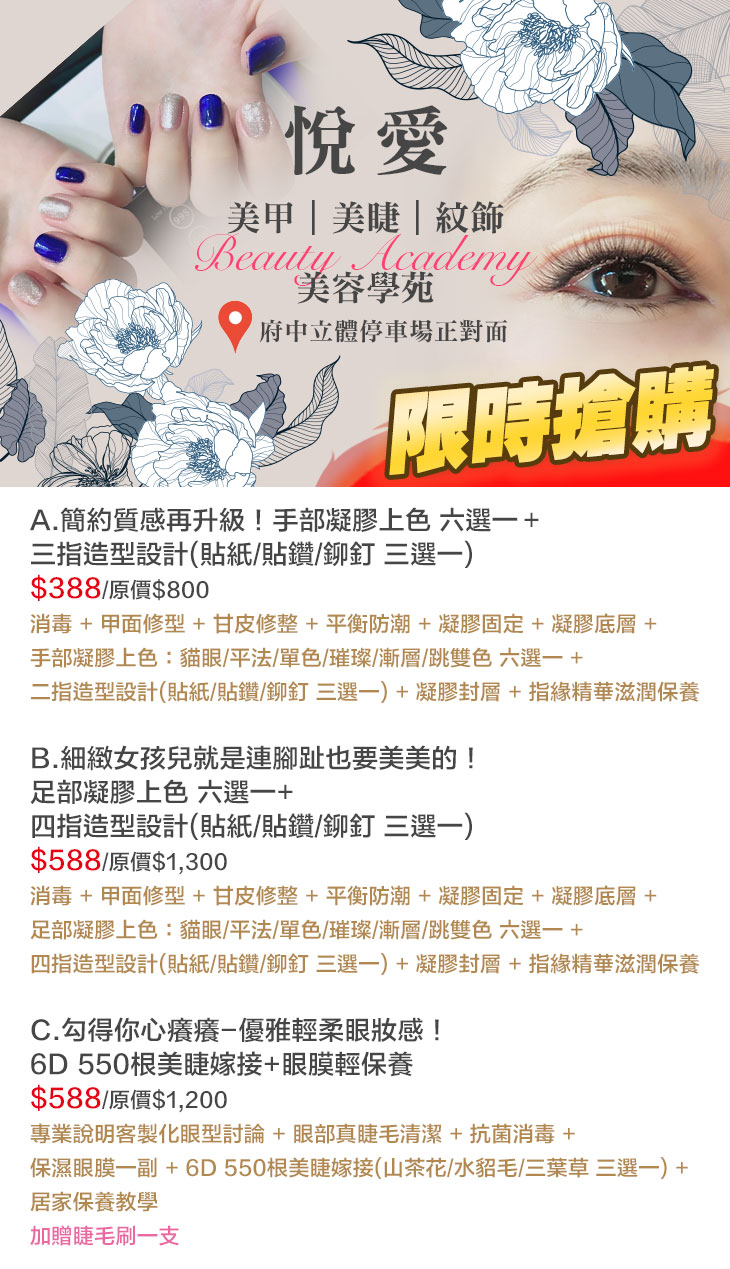 A.簡約質感再升級!手部凝膠上色 六選一+三指造型設計(貼紙/貼鑽/鉚釘 三選一) / B.細緻女孩兒就是連腳趾也要美美的!足部凝膠上色 六選一+四指造型設計(貼紙/貼鑽/鉚釘 三選一) / C.勾得你心癢癢-優雅輕柔眼妝感!6D 550根美睫嫁接+眼膜輕保養