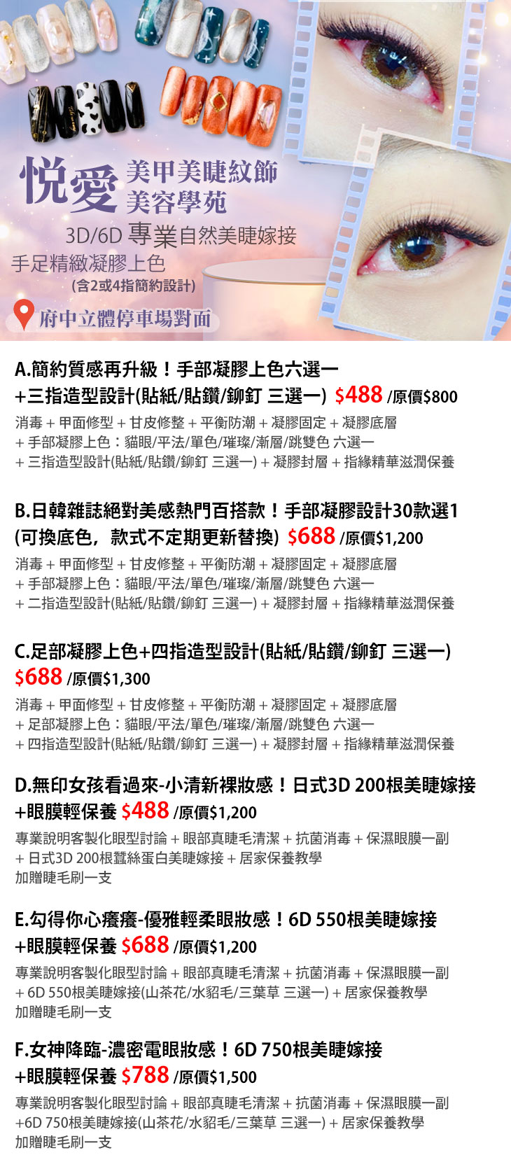 A.簡約質感再升級!手部凝膠上色六選一+三指造型設計(貼紙/貼鑽/鉚釘 三選一) / B.手部凝膠設計30款選1(可換底色,款式不定期更新替換) / C.足部凝膠上色+四指造型設計(貼紙/貼鑽/鉚釘 三選一) / D.無印女孩看過來-小清新裸妝感!日式3D 200根美睫嫁接+眼膜輕保養 / E.勾得你心癢癢-優雅輕柔眼妝感!6D 550根美睫嫁接+眼膜輕保養 / F.女神降臨-濃密電眼妝感!6D 750根美睫嫁接+眼膜輕保養