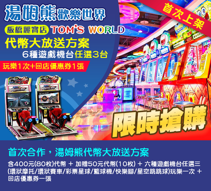 〈含400元(80枚)代幣 + 加贈50元代幣(10枚) + 六種遊戲機台任選三(環狀摩托/環狀賽車/彩票星球/籃球機/快樂腳/星空跳跳球)玩樂一次 + 回店優惠券一張〉