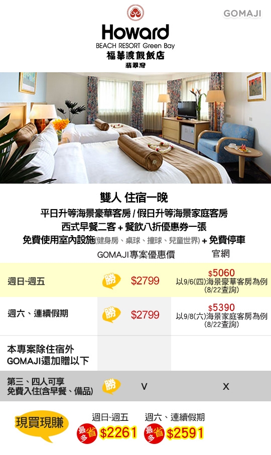 ★ 假日、加人不加價!麻吉好康:第三、四人可享免費入住(含早餐、備品)