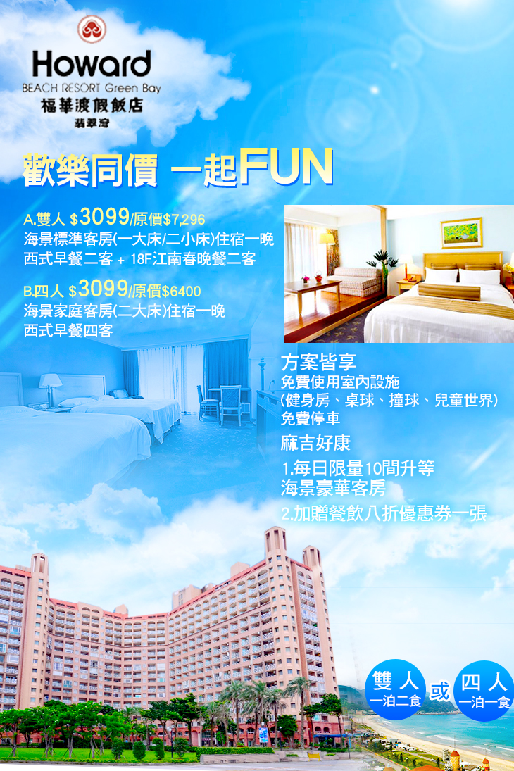 ★ 雙人一泊二食(早餐+晚餐)或四人一泊一食(早餐),歡樂同價只要3099元!