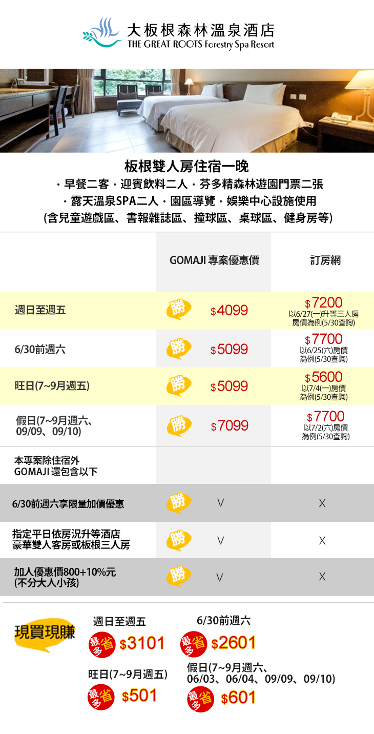 ★ 6/30前週六享限量加價優惠!指定平日(6/30前週日~週四及7~9月週一~週四)依房況升等酒店豪華雙人客房或板根三人房(含第三人早餐),手刀搶房趁現在!