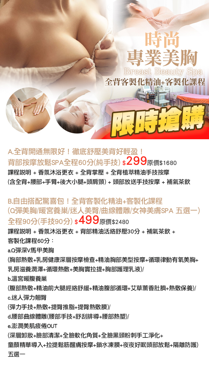 A.全背開通無限好!徹底舒壓美背好輕盈!背部按摩放鬆SPA全程60分(純手技) / B.自由搭配驚喜包!全背客製化精油+客製化課程(Q彈美胸/暖宮養巢/迷人美臀/曲線體雕/女神美膚SPA 五選一)全程90分(手技90分)