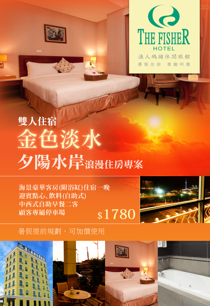 矗立於漁人碼頭旁的【淡水漁人碼頭休閒旅館】,在淡水河畔建立了一座愛的樂園,白天你能沐浴陽光,享受藍天白雲帶給你的寬闊心情,黃昏時刻可以和愛人悠閒的在河堤漫步,波光粼粼的淡水與你倆相輝映,拋開沉重的壓力,選個一夜帶著簡便行李入住,誰說旅行一定要到遠距離。
