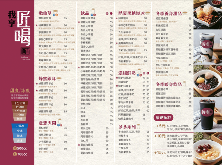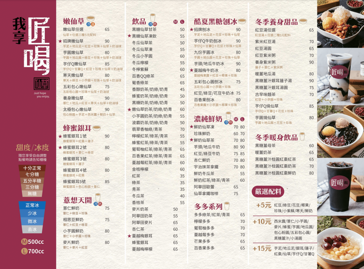 精緻的甜品店「匠喝嫩仙草」,堅持選用新鮮食材及原料,提供各式美味甜品,其中以仙草甜品最為推薦!環境溫馨舒適,讓您走進來就彷彿回到了家一般,一邊享受老闆精心製作的美味甜品,一邊與好友聊天談心,美好的一天就該如此度過,快揪三五好友一同來享用吧!