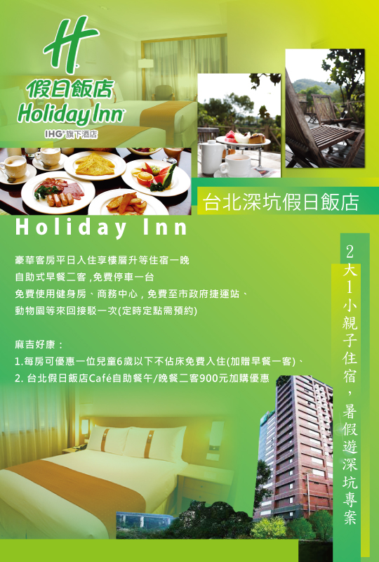 全球知名洲際酒店集團旗下品牌Holiday Inn,在台打造五星級且提供國際水準服務的超優飯店。座落於景色優美怡人的深坑區,九分鐘車程即可抵達台北101大樓與信義商圈,讓您品味生活、放鬆心靈、享受美食、逛老街,所有夢想一次實現!