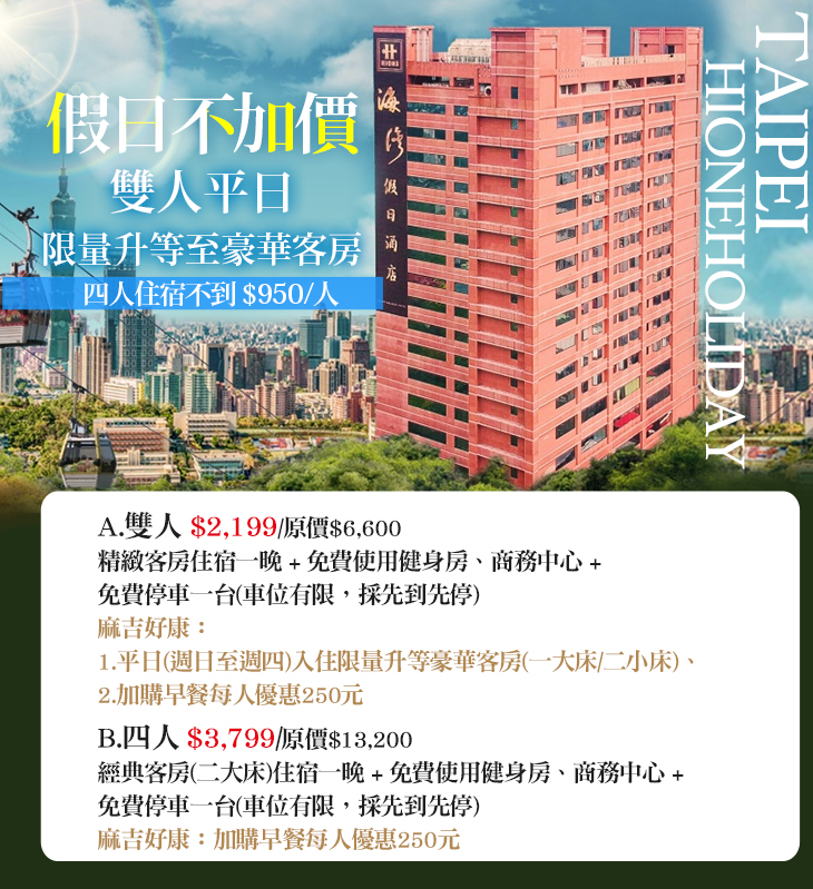★ A方案加碼升等,平日(週日~週四)入住限量升等豪華客房(一大床/二小床)適合2大或2大1小(未滿12歲)入住,B方案二大床適合親子、朋友最多4人一起入住!