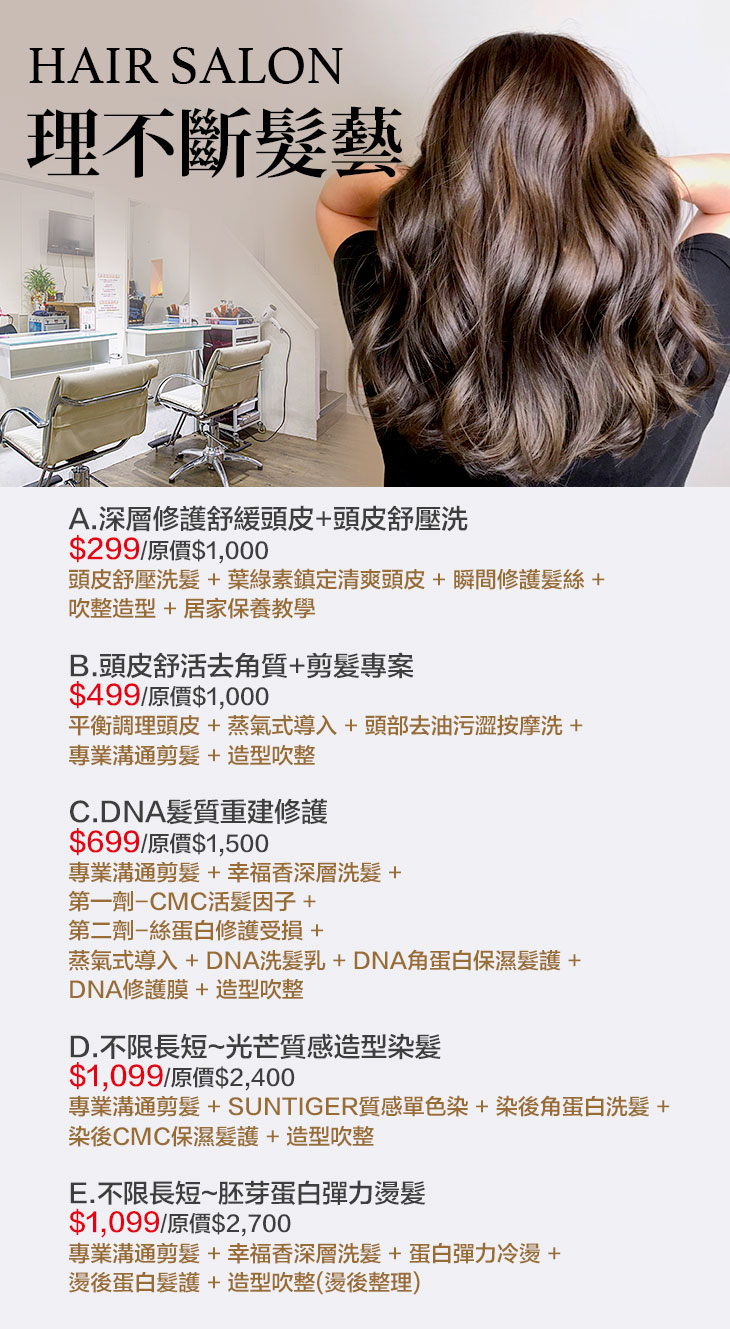 A.深層修護舒緩頭皮+頭皮舒壓洗 / B.頭皮舒活去角質+剪髮專案 / C.DNA髮質重建修護 / D.不限長短~光芒質感造型染髮 / E.不限長短~胚芽蛋白彈力燙髮