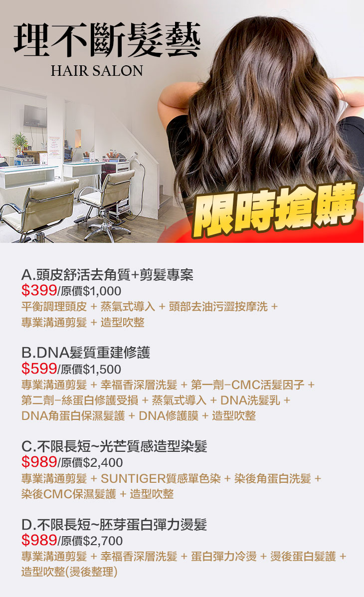 A.頭皮舒活去角質+剪髮專案 / B.DNA髮質重建修護 / C.不限長短~光芒質感造型染髮 / D.不限長短~胚芽蛋白彈力燙髮