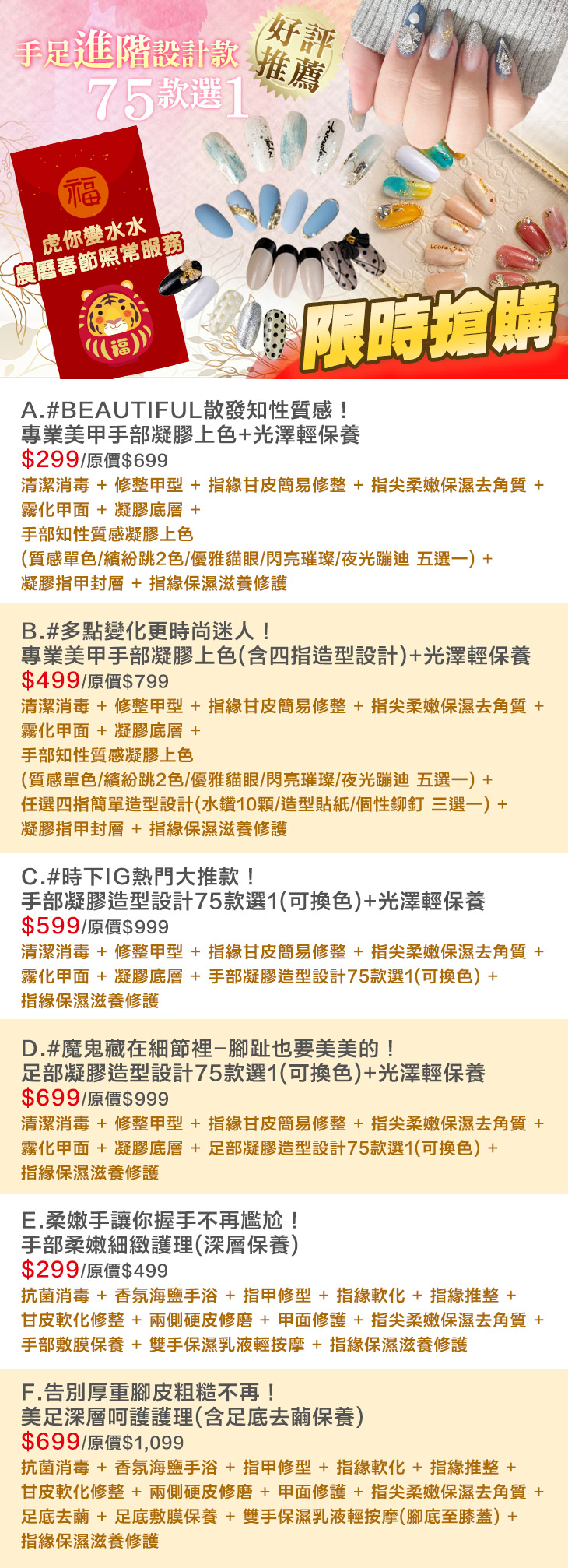A.#beautiful散發知性質感!專業美甲手部凝膠上色+光澤輕保養 / B.#多點變化更時尚迷人!專業美甲手部凝膠上色(含四指造型設計)+光澤輕保養 / C.#時下IG熱門大推款!手部凝膠造型設計75款選1(可換色)+光澤輕保養 / D.#魔鬼藏在細節裡-腳趾也要美美的!足部凝膠造型設計75款選1(可換色)+光澤輕保養 / E.柔嫩手讓你握手不再尷尬!手部柔嫩細緻護理(深層保養) / F.告別厚重腳皮粗糙不再!美足深層呵護護理(含足底去繭保養)