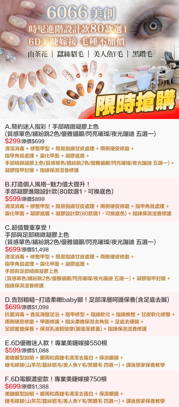 A.簡約迷人指彩!手部精緻凝膠上色(質感單色/繽紛跳2色/優雅貓眼/閃亮璀璨/夜光蹦迪 五選一) / B.打造個人風格-魅力值大提升!手部凝膠進階設計款(80款選1,可換底色) / C.超值雙重享受!手部與足部精緻凝膠上色(質感單色/繽紛跳2色/優雅貓眼/閃亮璀璨/夜光蹦迪 五選一) / D.告別粗糙-打造柔嫩baby腳!足部深層呵護保養(含足底去繭) / E.6D優雅迷人款!專業美睫嫁接550根 / F.6D電眼濃密款!專業美睫嫁接750根