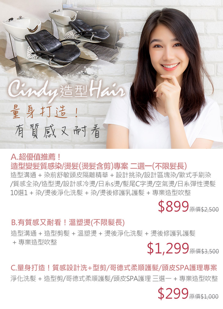 A.超優值推薦!造型變髮質感染/燙髮(燙髮含剪)專案 二選一(不限髮長) / B.有質感又耐看!溫塑燙(不限髮長) / C.量身打造!質感設計洗+型剪/哥德式柔順護髮/頭皮SPA護理專案