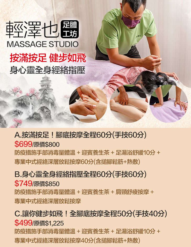 A.按滿按足!腳底按摩全程60分(手技60分) / B.身心靈全身經絡指壓全程60分(手技60分) / C.讓你健步如飛!全腳底按摩全程50分(手技40分)