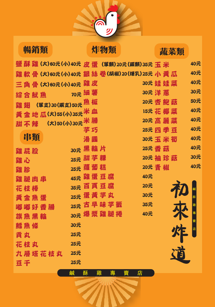 位於熱鬧的四號公園附近,噴香氣息飄來,讓經過的人都難以抵擋它的誘惑呀!【初來炸道】為了讓顧客品嚐到最好的炸物風味,堅持選用新鮮食材、悉心備料,每份炸物皆為現點現炸,以確保肉質與食材的新鮮度,搭配炸得金黃酥脆的麵衣,無論是鹹酥雞、雞蛋豆腐、甜不辣等,每一樣都美味到不行 ~ 肚子餓時不妨來吃看看,絕對讓您一試成主顧唷!