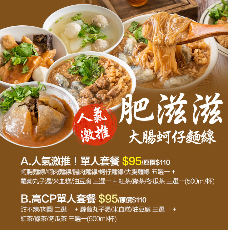 精選品質新鮮甘甜的蚵仔,搭配文火慢燉、細細熬製入味的麵線,讓麵線渾厚濃郁的香氣,與蚵仔的清甜結合,經典不敗的組合,讓人百嚐不膩!