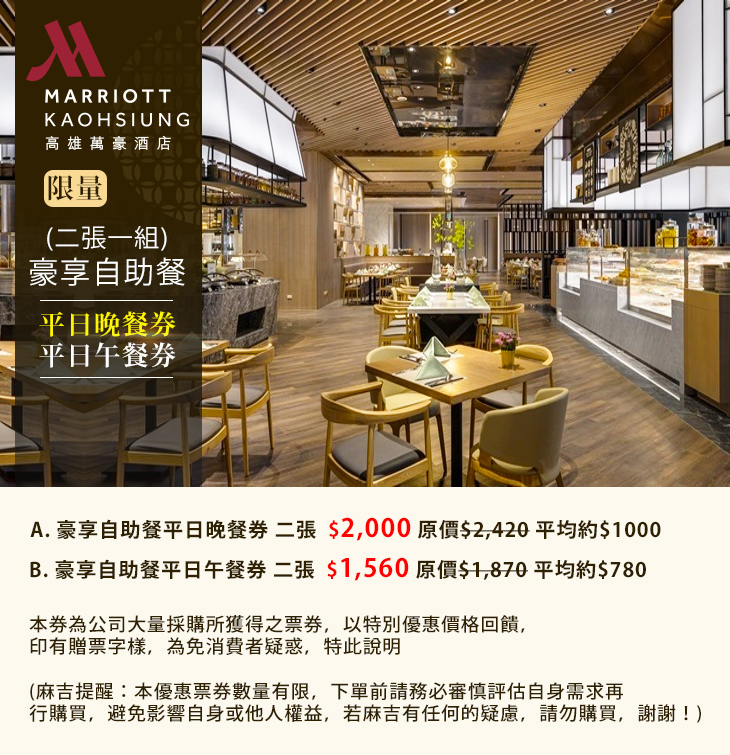 【高雄萬豪酒店 Kaohsiung Marriott Hotel】感謝麻吉們熱烈搶購,已全數賣光光。