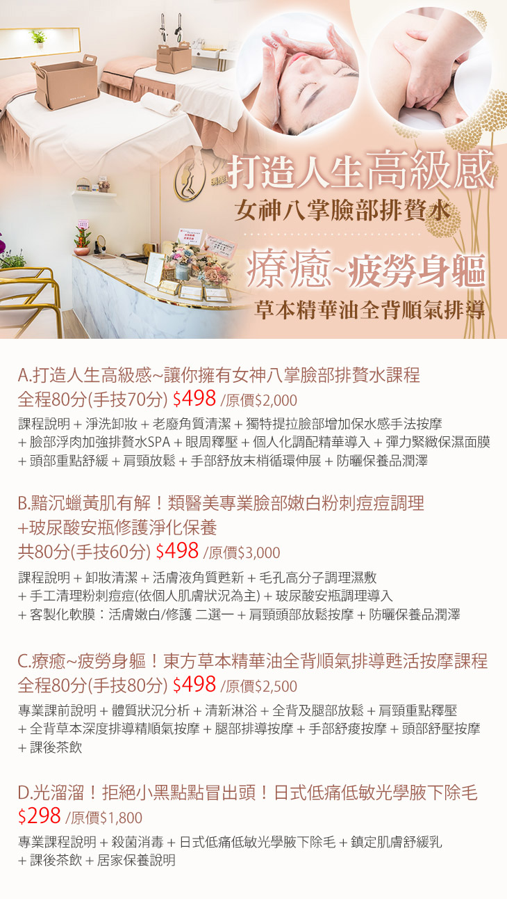 A.打造人生高級感~讓你擁有女神八掌臉部排贅水課程全程80分(手技70分) / B.黯沉蠟黃肌有解!類醫美專業臉部嫩白粉刺痘痘調理+玻尿酸安瓶修護淨化保養共80分(手技60分) / C.療癒~疲勞身軀!東方草本精華油全背順氣排導甦活按摩課程全程80分(手技80分) / D.光溜溜!拒絕小黑點點冒出頭!日式低痛低敏光學腋下除毛