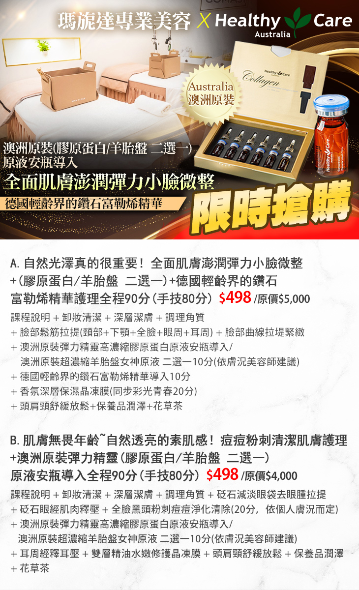 A.自然光澤真的很重要!全面肌膚澎潤彈力小臉微整+(膠原蛋白/羊胎盤 二選一)+德國輕齡界的鑽石富勒烯精華護理全程90分(手技80分) / B.肌膚無畏年齡~自然透亮的素肌感!痘痘粉刺清潔肌膚護理+澳洲原裝彈力精靈(膠原蛋白/羊胎盤 二選一)原液安瓶導入全程90分(手技80分)