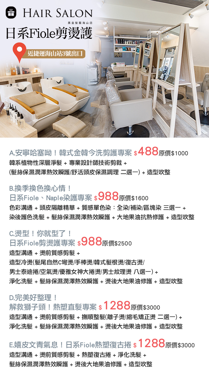 A.安寧哈塞呦!韓式金韓今洗剪護專案 / B.換季換色換心情!日系Fiole、Naple染護專案 / C.燙型!你就型了!日系Fiole剪燙護專案 / D.完美好整理!解救獅子頭!熱塑直髮專案 / E.嬉皮文青氣息!日系Fiole熱塑復古捲