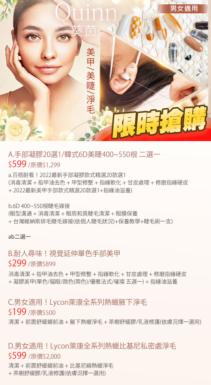 A.手部凝膠20選1/韓式6D美睫400~550根 二選一 / B.耐人尋味!視覺延伸單色手部美甲 / C.男女適用!Lycon萊康全系列熱蠟腋下淨毛 / D.男女適用!Lycon萊康全系列熱蠟比基尼私密處淨毛