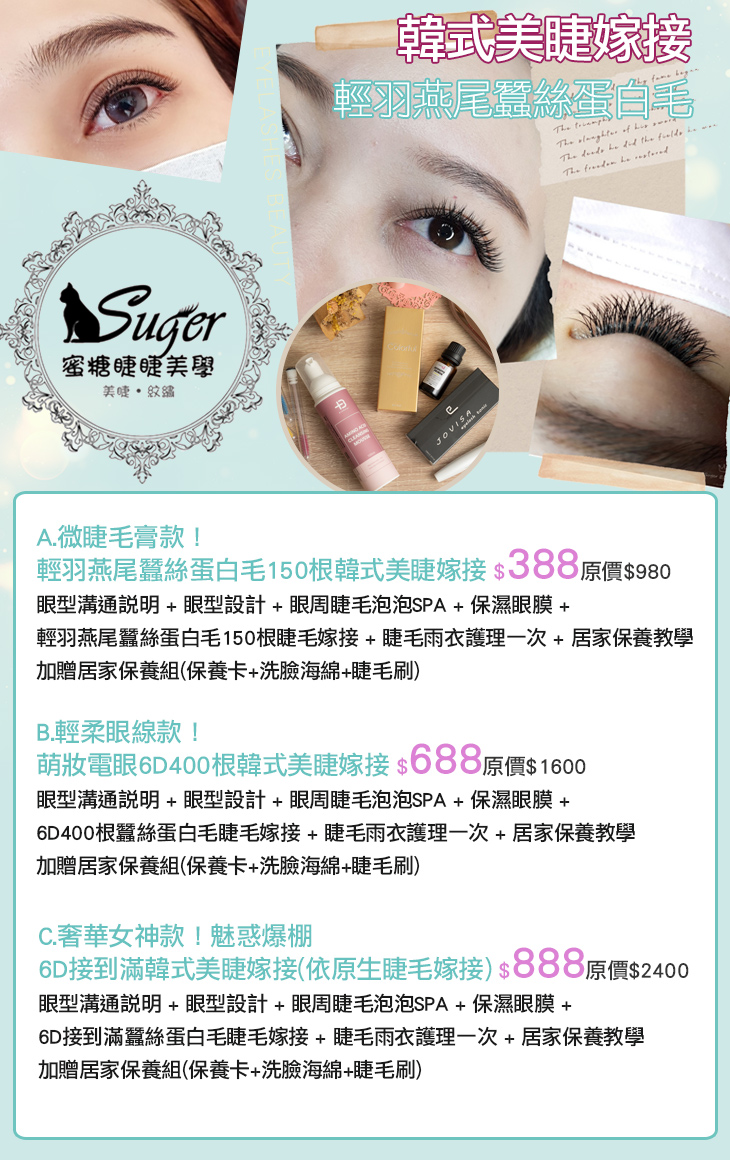 A.微睫毛膏款!輕羽燕尾蠶絲蛋白毛150根韓式美睫嫁接 / B.輕柔眼線款!萌妝電眼6D400根韓式美睫嫁接 / C.奢華女神款!魅惑爆棚6D接到滿韓式美睫嫁接(依原生睫毛嫁接)