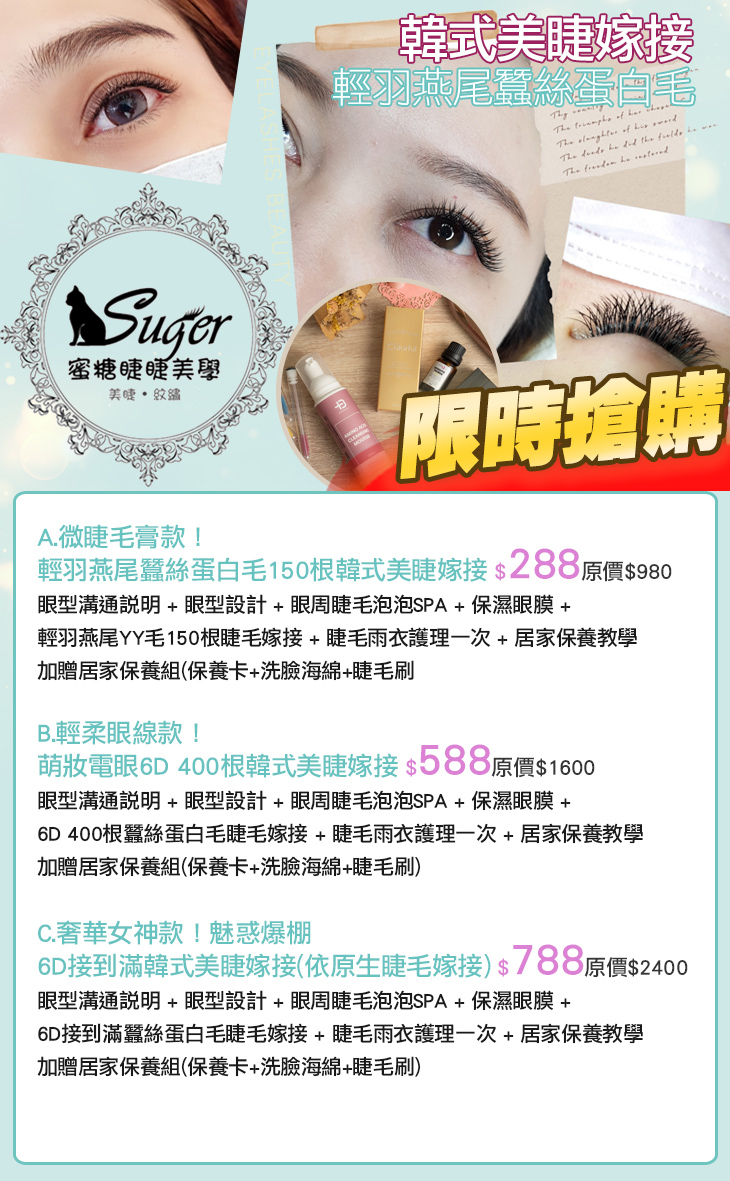 A.微睫毛膏款!輕羽燕尾蠶絲蛋白毛150根韓式美睫嫁接 / B.輕柔眼線款!萌妝電眼6D400根韓式美睫嫁接 / C.奢華女神款!魅惑爆棚6D接到滿韓式美睫嫁接(依原生睫毛嫁接)
