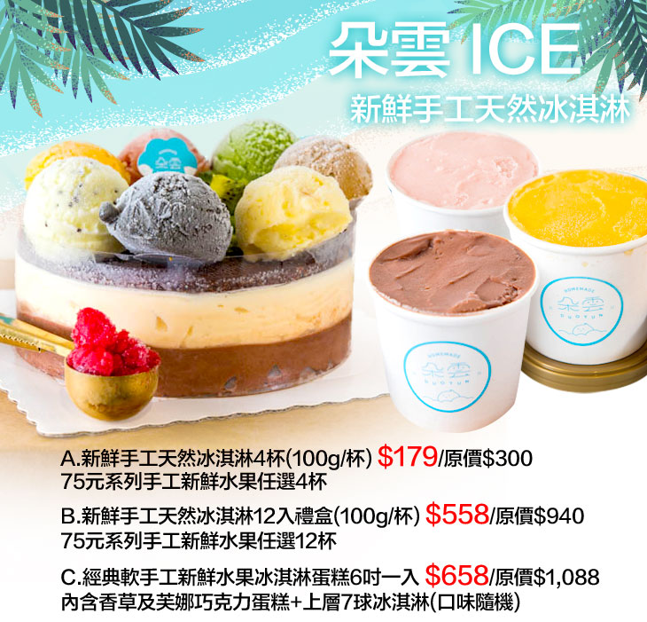 A.新鮮手工天然冰淇淋4杯(100g/杯) / B.新鮮手工天然冰淇淋12入禮盒(100g/杯) / C.經典軟手工新鮮水果冰淇淋蛋糕6吋一入