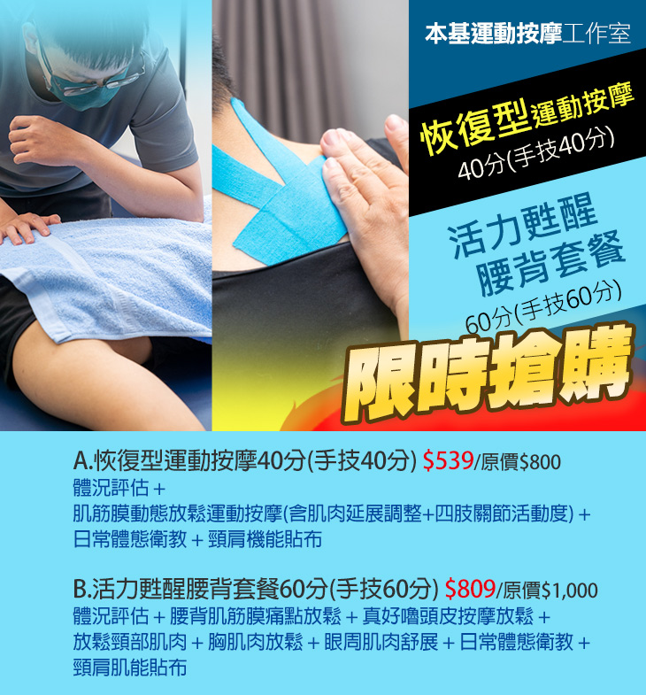 〈體況評估 + 肌筋膜動態放鬆運動按摩(含肌肉延展調整+四肢關節活動度) + 日常體態衛教 + 頸肩機能貼布〉